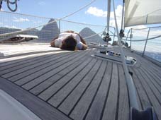 Tijdens lange afstanden een handige parkeerplaats voor de dinghy. Voor anker een ruime voortuin.