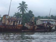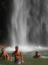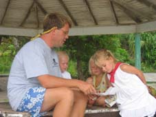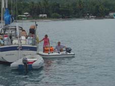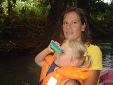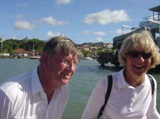 We ankeren in Martinique voor het Bakoua hotel waar (o)pa Hans en (o)ma Ria 2 weken logeren. Vanuit de ontbijtzaal zien ze ons 's ochtends vroeg aankomen en in de dinghy stappen. Ze wachten ons op op de hotelsteiger. Wat heerlijk om elkaar weer te zien. Lisanne denkt dat Sinterklaas nog even terug is als alle cadeaus uit Nederland uit de koffers getoverd worden. Veel dank ook aan Harry, (grote) Hilda en familie de Man. Na de ongerepte Grenadines is het bijna raar om weer in de "bewoonde wereld" te zijn. Er moet na bijna 4 weken "niksland" opeens weer van alles: veel wassen, boodschappen doen, de boot weer eens goed schoonmaken, naar het internetcafé, een auto huren enz. We stouwen de koelkast weer lekker vol met franse kaasjes, merguez worstjes en wijn. We profiteren stiekem mee van deze luxe resortvakantie: een zwembad en privéstrand met enorme badlakens en strandbedden, rieten parasolletjes en elke dag een badmodeshow. ] Oneindig lang douchen of in bad en elke dag schone spierwitte handdoeken is voor ons ook een feestje. Omdat opa en oma zich regelmatig enthousiast over de kindjes ontfermen, is het voor ons ook echt vakantie. Bas leest op het strand graag over de avonturen van zijn collega reizigers... We maken een tochtje naar Les Trois Islets. Een leuk dorpje waar we met z'n allen voor anker overnachten, genieten van de stilte en lekker zwemmen. De uitgebreide franse lunch overtreft onze stoutste culinaire verwachtingen (foie gras met vijgencompote en gegrilde vis met kokos, mmmm). Bas haakt helaas af omdat hij aan de wc gekluisterd is. Terug in Anse Mitan gaan mama Ria en Hilda ouderwets een middagje shoppen. Verder gaan we droog snorkelen met de Aquascope, een soort onderzeeboot. Sem oefent veelvuldig zijn nieuwste woordje "visvisvisvisvisvisvis" en Lisanne ziet heel veel Nemo's. Na een nachtje vreselijk hobbelen aan de steiger breken we onze was- en schoonmaak-marathon vervroegd af om een rustiger plekje op te zoeken. We varen naar Grand Anse d'Arlet. Een perfect zeiltochtje voor de wind op de genua. Daar zien we de Nelson en Arpeggio gelukkig weer, zodat er meteen gezellig geborreld wordt. De autoloze 'boulevard' van deze mooie baai is een heel groot strand met allemaal leuke restaurantjes en cafeetjes. Perfect om een middagje met z'n allen door te brengen. We varen weer terug naar ons basiskamp. Onderweg steekt een schildpad even zijn koppie boven water naast de boot! Terug in Anse Mitan gaat er een druk programma van start. We huren een auto en verkennen dit ontzettend franse eiland. We bezoeken de Balatatuinen: veel flora en een beetje fauna (kolibri's). Tijdens de lunch met prachtig uitzicht durven de mannen lambi te bestellen (de glibberige bewoner van zo'n enorme schelp waarin je de zee kunt horen) en vinden het nog lekker ook. 's Middags zien we tig soorten bananen in het bananenmuseum: groene en rode, zoete en hartige, design bananen en ook hele grote en hele kleine. Verder blijk je echt oneindig veel te kunnen maken van bananen. Zo'n leerzaam museumbezoek hoort gewoon bij je algemene (bananen)ontwikkeling. Helaas zijn we er nog steeds niet achter waarom ze krom zijn, maar... er zijn ook rechte! We sluiten af met een bezoekje aan rumstokerij Saint James (waar Bas ooit productmanager van was en toch zeker 2 dozen per jaar van verkocht). Als je frequent rum(punch) drinkt, moet je toch een beetje weten wat je binnenkrijgt. Voor de afwisseling kunnen we voortaan ook eens een Ti-punch bestellen of zelf brouwen (met suikersiroop en citroen). We vragen ons af waarom we met pa en ma Kornman toch altijd bij een drankproeverij terecht komen. Het zal wel toeval zijn. Op de terugweg stoppen we nog even bij de Carrefour. Heerlijk om weer eens een kofferbak vol te kunnen laden met proviand. De dinghy zinkt bijna als we alles aan boord brengen. De volgende ochtend moeten we alweer vroeg op. Bas krijgt als vervroegd verjaardagscadeau "duiken voor 2 met oppasservice". Bijna onwennig gaan we weer eens echt met z'n 2-en op stap. Met een snelle raceboot worden we naar de duikstek gebracht, waar we onder water genieten van enorme koraaltuinen, kleurige visjes en... een schildpad! De tijd vliegt echt voorbij. Voor we 't weten hebben we de afscheidslunch achter de kiezen, waarna de taxi naar het vliegveld alweer voorrijdt. Het is echt even slikken om weer voor maanden afscheid te moeten nemen. Deze gedeelde vakanties zijn een enorme bonus tijdens onze reis. Hoe vaak ga je anders samen met je ouders of goede vrienden op vakantie? Deze bijzondere weken pakt niemand ons meer af. We installeren ons weer aan boord en zijn snel gewend aan de iets minder luxe omstandigheden. Het anker gaat op om na een overnachting bij Les Trois Islets door te varen naar Dominica. Na een dagje motoren komen we vlak voor zonsondergang aan in Portsmouth, waar onze flottieljevrienden ook net gearriveerd zijn. Je ziet duidelijk de gevolgen van de vele orkanen die hier de afgelopen jaren schade aangericht hebben. Er liggen diverse bootwrakken al bijna 10 jaar tegen de kant te roesten. Niemand heeft er geld om ze op te laten ruimen, een droevig gezicht. Verder is Dominica een droomeiland. Eindelijk zijn hier weer de boatboys. Danny brengt vers brood, fruit en groente ("today is Danny day"). Hij laat de lokale producten proeven en vertelt hoe we het klaar moeten maken. Martin regelt voor ons een auto/wandeltocht over het eiland en een boottocht over de Indian River. Gids Maclin rijdt ons over dit vulkanische eiland dat zo vruchtbaar is dat gelukkig niemand honger hoeft te lijden. Hij laat zien waar en hoe mango, ananas, papaya, dasheen, yam, grapefruit, thee, tijm en laurier groeien. Weer beseffen we hoe ver we gewoonlijk van de natuur afstaan. We mogen hier en daar wat plukken, zodat we supervers kunnen eten en zelfgeplukte thee kunnen zetten (bijna net zo lekker als Pickwick). Met 6 volwassenen en 6 kinderen tussen de 0 en bijna 4 jaar durfden we het net aan om de korte wandeling door het regenwoud te maken. Het blijkt e