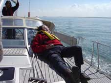 Juli - België & Engeland Het eerste buitenland ontmoeten we in Oostende. Na een aantal dagen BF 7 in Breskens is er een dag met minder wind, ofwel, geen wind. Dat is dan weer het andere uiterste. Papa Hans vaart mee, en heeft zoals je kunt zien een heerlijk relaxte dag. In Oostende gaan we nog even lekker uit eten met opa Hans en oma Ria om afscheid te nemen. Joost de Boer kwam donderdagavond in Oostende voor een lang weekend aan boord, met het idee om mee te varen naar Engeland. Vrijdag zijn we lekker blijven liggen in de haven en hebben we heerlijk mosselen gegeten. Zaterdag leek het weer goed en zijn we vertrokken richting Dunkerque. Het ging echter zo voorspoedig dat we zijn doorgegaan naar Calais en ja hoor: we werden beloond met een dikke BF 6 pal tegen. En als je dan vergeet de luiken goed dicht te doen krijg je dit: De volgende dag Frans stokbrood en croissants gehaald en vertrokken richting Engeland. Halverwege vervangt de vlaggenman de Franse voor de Engelse vlag en we letten even niet op, waardoor we bijna tegen een containerschip opvaren.... Het voelt, door alle stormen die we de laatste dagen hebben moeten doorstaan (in de haven), als een geweldige prestatie om in Engeland aan te komen: champagne momentje!