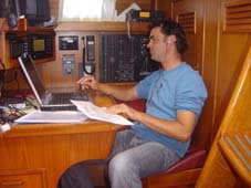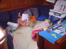 Mei - Van Bermuda naar Azoren (1788 mijl; 13,5 dagen) Donderdag 19 mei zijn we klaar voor vertrek. Lisanne en Sem leven zich lekker uit in een parkje. Nog even water en diesel tanken, een laatste ijsje en daarna verlaten we om 17.00 uur Bermuda. Het is meteen spannend. Er is een prachtige halve wind, maar we weten dat er wat lage druk gebieden zijn en zelfs een "Adrian". Bas is de hele dag bezig met het weer. 's Ochtends is er een nederlands netje via de SSB radio. Omdat wij alleen kunnen ontvangen, mailen we onze positie dagelijks naar de Arpeggio, die het doorgeven op het net. Ruud Kattenberg (van Zeilen) die de Pooh terugvaart, bespreekt dan het weerbericht. Daarna halen we de mail van Sidney binnen, onze persoonlijke weerman, en onze belangrijkste weerbron. 's Middags halen we de weerkaarten zelf binnen en 's avonds luisteren we naar Southbound 2 van Herb. Er zijn een paar boten vlakbij ons die een persoonlijk Herb advies krijgen. Zo krijgen we een goed beeld van wat we kunnen verwachten. Zaterdag 21 mei hebben we dan ook ruim op tijd alles goed vastgesjord. We hobbelen en klotsen met 25 knopen wind zoveel mogelijk zuidwaarts. Een ongustige koers waarmee we niets opschieten naar de Azoren. Maar we hopen daarmee de voor zondag voorspelde "gale" zoveel mogelijk te omzeilen. Dat lukt gedeeltelijk. Zondag zit Aad steady onder de buiskap op een zeer beweeglijke Adagio. Hilda probeert niet teveel te denken aan haar jaarclub die een week in Spanje zit en houdt de kindjes bezig op de bedbank. Er worden liggend vlinders van gekleurde pijperagers gemaakt en een knipperende Nemo onder de slaapzak zorgt ook voor uren pret. Schipper Bas houdt koelbloedig koers en zeilen in de gaten en checkt de laatste weerberichten. We maken flinke klappers. Aad krijgt een grote golf in de kuip, net voordat hij zijn wacht mag aflossen. Hij druipt drijfnat af. Bij een rare schuiver wordt Hilda met Sem van de bank gelanceerd, met wat blauwe plekken als gevolg. Bij elke inspanning ligt zeeziekte op de loer. De droge cräckers komen goed van pas. Alleen de kindjes hebben helemaal nergens last van. Hun avondmaal bestaat uit oude boterhammen, felroze yoghurt en chips. Wij moeten na elke opgediende gang even gaan liggen of naar buiten. Toch hebben we het gevoel alles onder controle te hebben. De Adagio gaat er geweldig doorheen met zwaar gereefd grootzeil en gereefde kotterfok. Je zit dan alleen wel te hopen dat alles heel blijft en het niet heel veel erger wordt. Zondagnacht neemt de wind toch nog iets verder toe. Het slotakkoord brengt een constante 35 knopen wind (windkracht 8) met uitschieters naar 39. Bas werpt de oceaan vlak voor het einde voor straf een poepluier toe. Wel handig om te weten dat dat helpt. En dan wordt plotseling alles weer rustig. Later horen we dat de Mariele, 100 mijl noorderlijker, 50 tot 60 knopen wind heeft gehad. We hebben zeker geen spijt dat we een dagje omgevaren zijn. We kabbelen voort en rollen heerlijk (not) op westenwind weinig. Het beetje wind wordt goed benut door een dagje met de halfwinder te varen. Op een stille avond zien we een haaievin voorbij glijden, scary. Er komen ook regelmatig dolfijntjes langs om een springshow te geven. Vreemd genoeg zien we geregeld een vogel (land in zicht??) en ook zien we veel maffe 'ballonkwallen' lekker in het zonnetje voorbijdrijven. Dan rust de wind helemaal uit en motoren we een dagje. Ons kleine wereldje speelt zich voornamelijk af buiten in de kuip en binnen op de bedbank. Toch vervelen we ons nooit. We eten, drinken, slapen, lezen, spelen, knutselen, staren naar het grote water en draaien onze wachten. De dagen vliegen voorbij, de zon komt op en gaat weer onder. Ook de nachten zijn prachtig. De zee is tot rust gekomen en wordt verlicht door de volle maan. Als het een heel klein beetje gaat waaien, proberen we weer te zeilen. Zo passeren we tergend langzaam de "1000-mijl to go" mijlpaal en zijn we een dag later over de helft. Dit wordt gevierd met warme apfelstrudel (van de laatste 2 appels) met room en een uitgebreide douche. Het wordt helaas iedere dag een beetje kouder. Acht maanden hebben we geen lange broek aan gehad en op slippers gelopen. Dat beviel erg goed. Even wennen al dat stof om je lijf. 's Nachts zitten we zelfs al ingepakt in fleece en zeilpak. Ook de thermokleding is van zolder gehaald. En dan worden we echt beloond door de weergoden. De wind wordt NoordWest 15 knopen, halve wind schieten we door het water. Heerlijk comfortabel, een wereld van verschil. Volgens de weerberichten zit er op korte termijn gelukkig geen zwaar weer meer in de lucht voor ons. De wind draait alleen nog naar ZuidZuidWest, nog gunstiger. Met 7 tot 9 knopen op naar de Azoren. Het is heerlijk om er een echte zeiler bij te hebben. Aad geniet volop en zit zo'n 72 uur per etmaal op wacht. Overdag slapen vindt hij onzin. Daarnaast hebben we opeens een koffie- en theezetautoomAad en een afwasautoomAad aan boord, handig! We geven 'm een opa-opleiding zodat hij er helemaal klaar voor is mochten er ooit kleinkinderen komen. Vandaag heeft hij een lange vinger gegeten, morgen een poepluier verschonen? Nu er in Nederland spannende tijden zijn, vinden we het extra fijn dat we met de satelliettelefoon kunnen mailen. Als hij het niet doet, zijn we meteen van slag. Ook het thuisfront vraagt zich even af waarom er geen bericht is. Gelukkig doet hij 't al snel weer. We horen regelmatig hoe het gaat met Harry, die afgelopen dinsdag geopereerd is. We lezen dat de schoonvader van Aad in het ziekenhuis belandt, maar gelukkig snel weer naar huis mag. Ook krijgen we zo midden op de oceaan het goede nieuws dat vrijdag Fem Josine Janne in noodtempo geboren is. Carolien en Bas2, gefeliciteerd! We leven ons eenvoudige bootleven en ondertussen vaart de Adagio 24 uur per dag maar door en door. Onder de 8 knopen is al dagen een uitzondering. Het wiebelt behoorlijk maar ondanks dat weet Hilda met hulp van Lisanne toch heerlijke pizza, hartige taart of brood te bakken. Woensdag 1 ju