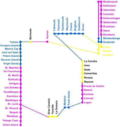 Via België, Engelse zuidkust, Spaanse- en Portugese